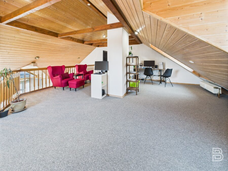 Das Hauptbadezimmer ist mit einer großen Eckbadewanne, Dusche, WC und Waschbecken ausgestattet. Das zweite Tageslichtbad verfügt ebenfalls über Dusche, WC und Waschbecken und bietet zusätzlich Platz für Waschmaschine und Trockner. Die offene Galerie im Wohnzimmer schafft eine einladende Atmosphäre und eignet sich perfekt als Arbeits- oder Rückzugsbereich. Von hier aus haben Sie Zugang zu einem ca. 100 m² großen Speicher – ideal als Lagerfläche.