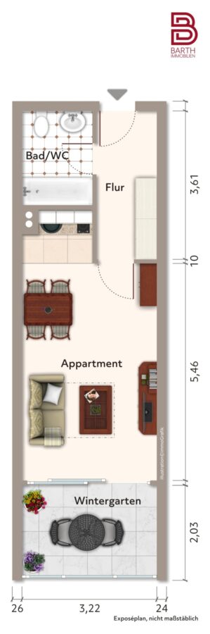 Die rund 35 m² Wohnung liegt nahe des Aufzugs und ist somit bequem und barrierearm erreichbar. Der lichtdurchflutete Wohn- und Essbereich bietet ausreichend Platz für eine gemütliche Couch und einen kleinen Esstisch. Der angrenzende Wintergarten sorgt nicht nur für zusätzlichen Komfort, sondern kann ideal als Schlafbereich genutzt werden.