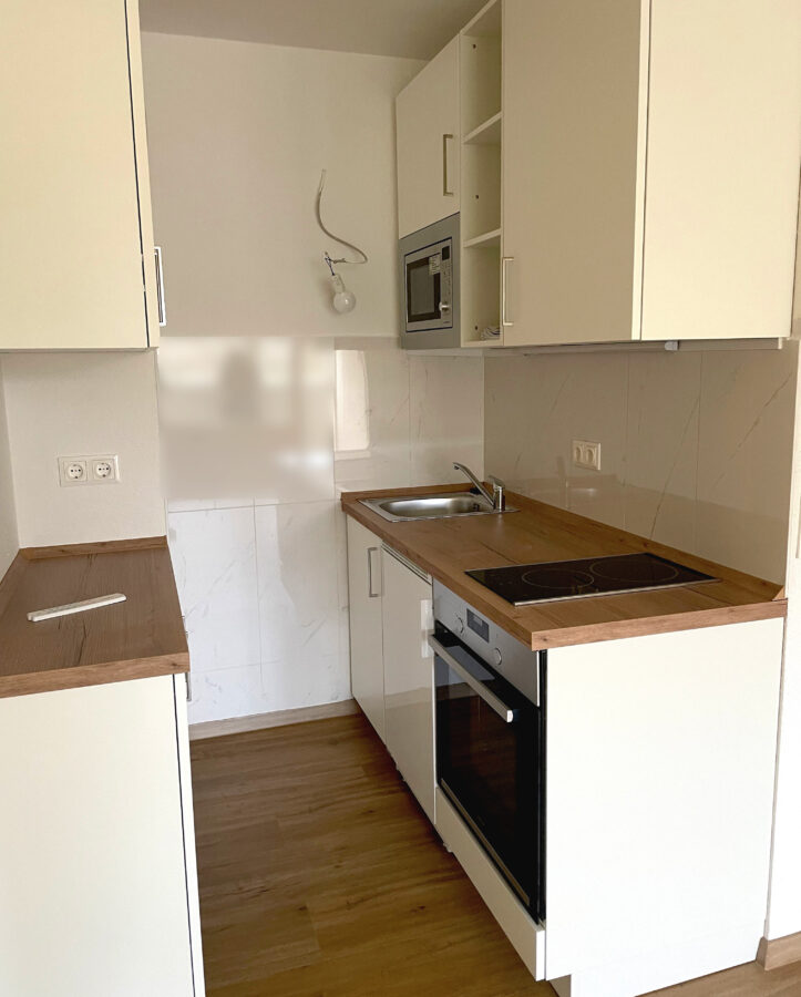 Die moderne Einbauküche ist mit einem Backofen, einem Herd mit Touch-Funktion, einem kleinen Kühlschrank, sowie einer fest eingebauten Mikrowelle ausgestattet. Das Badezimmer verfügt über eine Badewanne, ein WC und ein Waschbecken. Die neuwertige Waschmaschine, genau wie die Einbauküche ist bereits im Mietpreis enthalten.