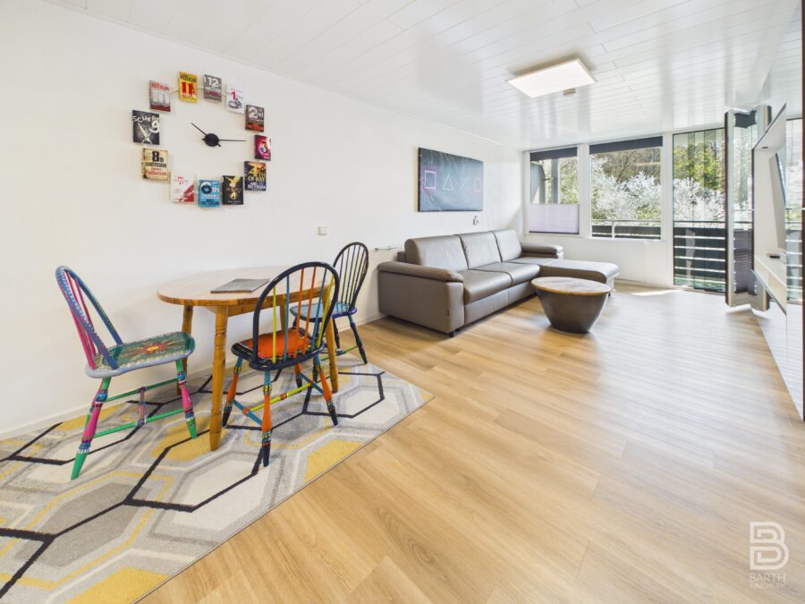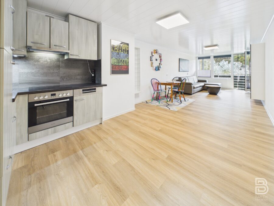 Die rund 45 m² große Wohnung wurde kürzlich umfassend modernisiert. Der lichtdurchflutete Wohn- und Essbereich bietet ausreichend Platz für eine gemütliche Couch mit integrierter Schlaffunktion sowie einen Esstisch. Vom Wohnbereich aus gelangen Sie auf den Balkon, der einen herrlichen Blick ins Grüne bietet.