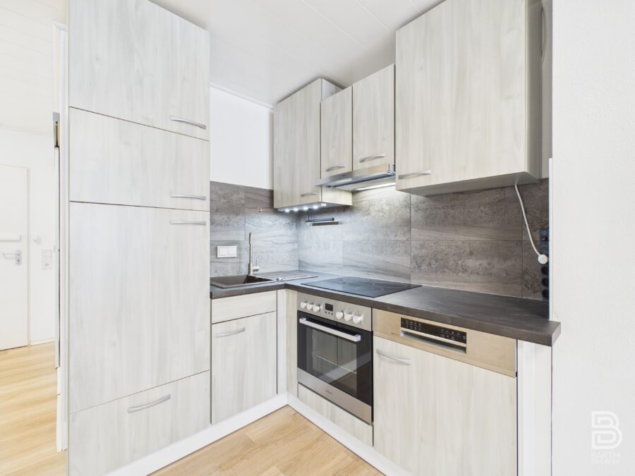 Die Einbauküche ist mit einem Backofen, einem Ceranfeld, einem Kühlschrank und einer Spülmaschine ausgestattet. Das Badezimmer verfügt über eine Dusche, ein WC sowie ein Waschbecken mit Unterschrank und einen Spiegelschrank.